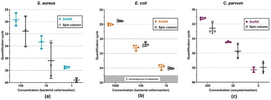 Determination of limit of detection in spiked wastewater samples extracted by the most efficient extraction procedures for S. aureus (a), E. coli (b) and C. parvum (c). SwiftX protocol was combined with proteinase K and a bead-beating step for S. aureus and E. coli, whereas for C. parvum, the proteinase K and SwiftX protocol was applied. Ten-fold serial dilutions of spiked wastewater were screened. After extraction, the quantification cycle of each dilution was measured using real-time PCR. All results were compared to a spin column reference method. Down to one bacterial cell of S. aureus per reaction was detected (a), while the threshold was ten with E. coli (b). For C. parvum, the limit of detection was two oocysts per reaction (c). Because of the E. coli pre-existence in wastewater, the shaded zone in (b) represents the background values.