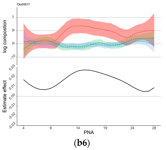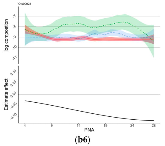 Control sign and OTUs for NSTRESS. (a) Control sign and NSTRESS. (b) OTUs associated with NSTRESS scores. (a) The proportions of the signs of the estimated coefficients of the control variables. Proportions of negative signs were shown as black blocks to the right, and those of positive signs were shown as light gray blocks to the left. Lower NSTRESS scores indicated better development, those variables in black indicated association with lower NSTRESS scores. The red dotted lines show the 90% of bootstrap. (b1–b6) The estimated time-varying effects of OTU on NSTRESS scores during the NICU stay. The x-axis represents the days after birth (PNA, postnatal age), the y-axis represents the log composition of the OTU abundance (top panel) and the estimated effect (bottom panel). The top panel “log composition” displays the trend of the log-transformed OTU compositions over the first 28 days of NICU stay for infants with different NSTRESS scores, with the infants being separated into three groups based on their NSTRESS score: high NSTRESS score (plotted in red), medium NSTRESS score (plotted in green), and low NSTRESS score (plotted in blue). The bottom panel “Estimate effect” is the estimated time-varying effects of OTUs on NSTRESS scores during the NICU stay.