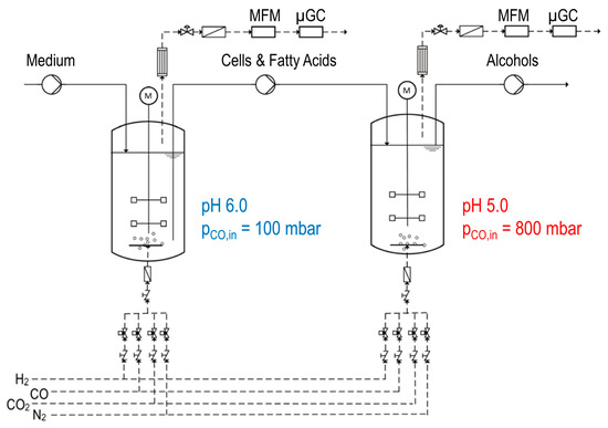 - Doll, K.; Rückel, A.; Kämpf, P.; Wende, M.; Weuster-Botz, D. Two stirred-tank bioreactors in series enable continuous production of alcohols from carbon monoxide with Clostridium carboxidivorans. Bioprocess Biosyst. Eng. 2018, 41, 1403–1416. [Google Scholar] [CrossRef]