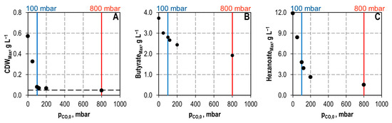 The CO sensitivity of C. kluyveri was studied with a mono-culture in batch-operated stirred-tank reactors with an initial supply of 6 g L−1 acetate and 15 g L−1 ethanol, respectively, at varying partial pressures (pCO) of up to 800 mbar CO in the gas phase. The resulting maximum CDW concentrations as well as the maximum butyrate and hexanoate concentrations are shown in Figure 2 as a function of the adjusted CO-partial pressures in the individual batch processes. Already a pCO of 100 mbar reduced the maximum CDW concentration of C. kluyveri by 86% compared to a batch process without CO addition. At 800 mbar CO total growth inhibition of C. kluyveri was observed, but the CDW concentration of C. kluyveri was stable for 144 h. Maximum hexanoate concentrations were reduced by 60% at 100 mbar CO, and by 87% at 800 mbar CO, respectively, compared to a batch process without CO in the gas phase. Reduction of the maximum butyrate concentrations with increasing pCO was less compared to the hexanoate concentrations (24% at 100 mbar CO, and 48% at 800 mbar CO, respectively).