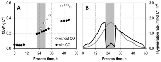 Batch cultivations of C. kluyveri in fully controlled stirred-tank bioreactors without CO in the inlet gas (open circles, grey line) and with gassing of 100 mbar CO indicated by the grey shaded area over a period of 9 h (black). (A) Cell dry weight concentrations (CDW); (B) Hydrogen-generation rate (T = 37 °C; pH = 6.0; P V−1 = 10.5 W L−1; Fgas = 0.042 vvm with 200 mbar CO2).