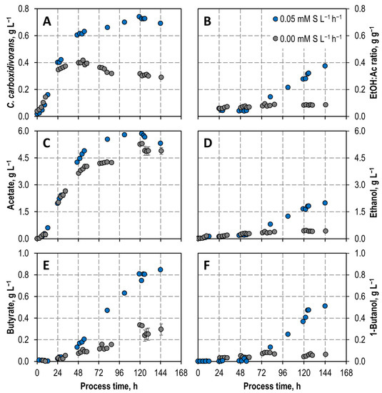 Autotrophic batch cultivations of C. carboxidivorans in continuously gassed, fully controlled stirred-tank bioreactors (T = 37 °C; pH = 6.0; P V−1 = 10.5 W L−1; 200 mbar CO2) with an initial CO partial pressure pCO,in = 100 mbar at Fgas = 0.042 vvm without continuous sulfide supply (grey) compared to the same autotrophic batch process with continuous sulfide supply of 0.05 mM S L−1 h−1 (blue). (A) Cell dry weight concentrations (CDW) of C. carboxidivorans; (B) ethanol: acetate ratio; (C) acetate concentrations; (D) ethanol concentrations; (E) butyrate concentrations; (F) butanol concentrations.
