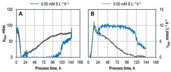 Partial pressures (A) and CO consumption rates (B) in stirred-tank reactors with C. carboxidivorans with sulfide feeding of 0.05 mM S L−1 h−1 (blue) and without sulfide feeding (grey) (T = 37 °C; pH = 6.0; P V−1 = 10.5 W L−1; Fgas = 0.042 vvm (10:20:70 CO:CO2:N2)).