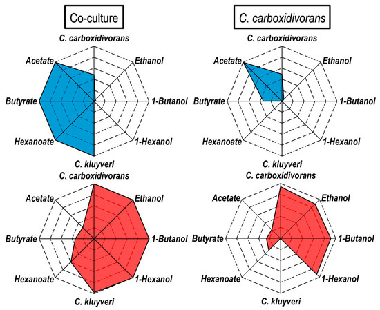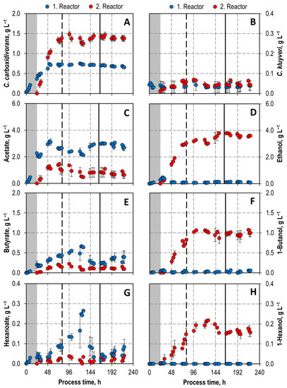 In contrast, no formation of the alcohols ethanol, 1-butanol, and 1-hexanol was observed in the first stirred-tank bioreactor of the continuous co-culturing process, whereas alcohol formation took place in the second reactor solely (Figure 7, Table 1). Final steady state concentration of 3.78 g L−1 ethanol, 0.97 ± 0.07 g L−1 1-butanol, 0.16 ± 0.01 g L−1 1-hexanol, and 0.77 ± 0.03 mg L−1 1-octanol were measured in the product solution of the cascade (Figure 6). The organic acids produced in the first bioreactor were not fully reduced to the corresponding alcohols in the second bioreactor of the cascade, but high alcohol/acid ratios were achieved (4.5 g ethanol g−1 acetate, 9.1 g 1-butanol g−1 butyrate, and 6.8 g 1-hexanol g−1 hexanoate, respectively).