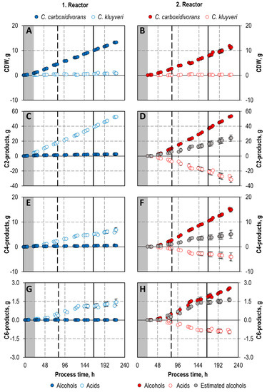 Cumulative production/consumption of cells ((A): CDW of the 1. Reactor; (B): CDW of the second reactor) and products ((C,E,G): C2,C4 and C6 products of the first reactor; (D,F,H): C2,C4 and C6 products of the second reactor) during autotrophic co-cultivation of C. carboxidivorans and C. kluyveri in a continuously operated stirred-tank bioreactor cascade with a dilution rate of 0.09 h−1 in the first reactor and 0.06 h−1 in the second reactor (P = 1 bar, T = 37 °C, pCO2,in = 200 mbar CO2). First reactor (blue): pH 6.0, pCO,in = 100 mbar, Fgas = 0.042 vvm, 0.05 mM S L−1 h−1; second reactor (red): pH 5.0, pCO,in = 800 mbar, Fgas = 0.083 vvm. Alcohols (ethanol, 1-butanol, 1-hexanol) as well as CDW of C. carboxidivorans are shown in full circles; acids (acetate, butyrate, hexanoate) as well as CDW of C. kluyveri are shown in open circles. Grey symbols show the estimated production of alcohols if the corresponding organic acids consumed in the second reactor will be reduced solely. The difference between these estimated cumulative productions of alcohols and the measured ones show de novo synthesis. Symbols show the mean and the minimum and maximum data of two independent gas fermentation experiments performed in the bioreactor cascade. The initial batch phase is shaded in grey. Vertical lines indicate process time of five mean hydraulic residence times of the first reactor (dashed line) and of the bioreactor cascade (solid line).
