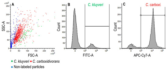 FISH-FC sample after 167 h from the first reactor of a continuously operated stirred-tank bioreactor cascade with C. carboxidivorans and C. kluyver. (A) Scattergram with the intensity of both fluorescence signals (C. kluyveri in green and C. carboxidivorans in red). Blue dots indicated other, non-labeled particles. The axes show the intensity of the fluorescence signal (arbitrary units). (B) Histograms with the cell counts of C. kluyveri vs. intensity of the FITC-fluorescence signal excited by a blue laser at 488 nm and detected using the 527/32 nm band-pass filter (FITC) gated between a fluorescence intensity of 103–105. (C) Histograms with the cell counts of C. carboxidivorans vs. intensity of the Cy5-fluorescence signal excited by red laser at 640 nm and detected by using the 660/10 nm band-pass filter (APC-Cy7) gated between a fluorescence intensity of 103–105 (A = Area).