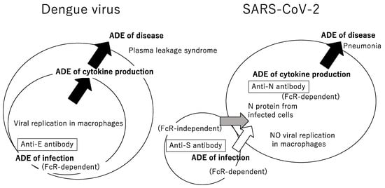 Historically, ADE has been an issue with dengue fever. There are four dengue virus serotypes, and it is known that about 1–5% of infected patients become severely ill when they are infected with a serotype that is different from that of their initial infection []. The emergence of critical dengue shock syndrome (DSS) and severe dengue hemorrhagic fever (DHF) was investigated in Thailand during the 1960s [,,], and studies have shown that individuals with pre-existing immunity against dengue virus are more likely to develop severe DSS and DHF [,]. This is attributed to the presence of antibodies with low neutralizing activity, i.e., they have the ability to bind to the virus but do not inhibit infection and facilitate the entry of the virus into macrophages []. Macrophages express the Fc gamma receptor (FcγR) on the cell surface, which recognizes the Fc portion of immunoglobulin G []. Macrophages actively take up (phagocytose) and digest foreign substances coated by antibodies (called opsonization) through the binding between FcR and Fc []. Once weakly bound antibodies dissociate from the virion after entry into the cells, the macrophage becomes more susceptible to infection than in the absence of the antibody. If the amount of strongly binding neutralizing antibody is insufficient to cover the entire virion surface, Fc and FcR-mediated enhancement of virion uptake into macrophages causes augmentation of viral infection.