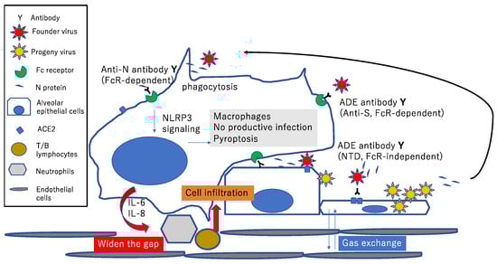 Potential pathways contributing to hyperactivation of macrophages and hyperinflammation in the alveolar cavity of COVID-19 patients. The right side shows the anti-S antibody-mediated, FcR-dependent, and FcR-independent enhancement of infection. The N-terminal domain (NTD) of the S protein is the main target of FcR-independent ADE antibody. Types I and II alveolar epithelial cells are infected through the ACE2 receptor, while alveolar macrophages do not support productive infection. The progeny virus and soluble N protein are released from infected epithelial cells. The N protein is recognized by the anti-N antibody. The left side shows FcR-dependent ADE of cytokine production. The C-terminal region of the N protein stimulates the inflammasome via NOD-, LRR-, and pyrin domain-containing protein 3 (NLRP3), and IL-6, IL-8 and TNF-α are secreted. IL-8 attracts neutrophils, which form neutrophil extracellular traps, damaging tissues. In addition, plasma leakage in the lung also reduces oxygenation.