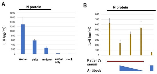 - Nakayama, E.E.; Kubota-Koketsu, R.; Sasaki, T.; Suzuki, K.; Uno, K.; Shimizu, J.; Okamoto, T.; Matsumoto, H.; Matsuura, H.; Hashimoto, S.; et al. Anti-nucleocapsid antibodies enhance the production of IL-6 induced by SARS-CoV-2 N protein. Sci. Rep. 2022, 12, 8108. [Google Scholar] [CrossRef]