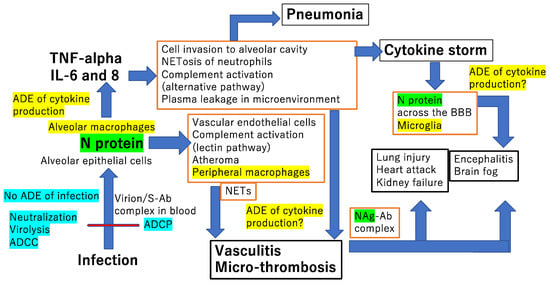The accumulated evidence during the COVID-19 pandemic indicates that SARS-CoV-2 infection causes micro-thrombosis that affects multiple organs, such as the heart, brain and kidneys, increasing the mortality burden in COVID-19 patients [,]. Figure 4 shows a schematic image of the involvement of ADE phenomena in COVID-19 pathogenesis. Macrophages in the lung and peripheral blood vessels, and microglia in the brain could play an important role in ADE of cytokine production when the co-existence of the N protein and anti-N antibody could amplify inflammation. Multiple organ failure is a downstream consequence of the cytokine storm. The resultant vasculitis can be thought of as micro-infarctions in the vascular beds of these organs. Hyperactivation of the complement system and tissue factor-enriched neutrophil extracellular traps (NETs) are key drivers in COVID-19 immunothrombosis []. Patients showed a higher number of polymorphonuclear neutrophils (PMN) forming NETs relative to healthy controls. The absolute number of PMNs forming NETs was inversely correlated with oxygen status and positively correlated with inflammatory markers such as C-reactive protein (CRP) and ferritin, and vascular cell adhesion molecule 1 []. Many more secondary pathological changes such as the formation of microclots and platelet activation have been observed in people with long COVID [].