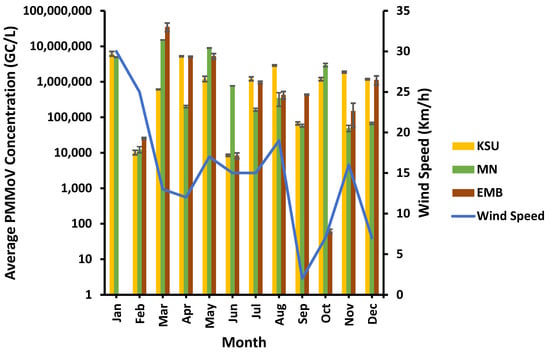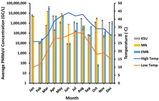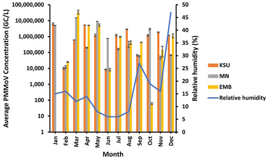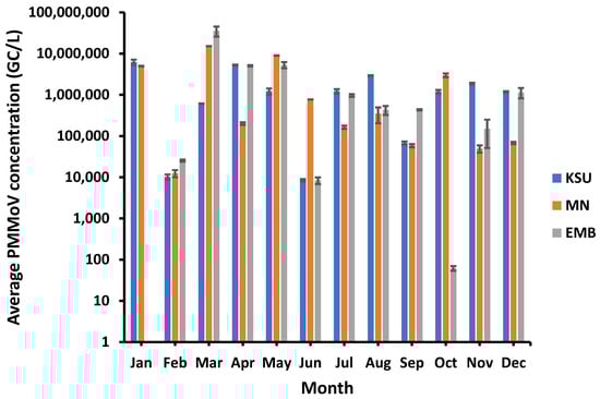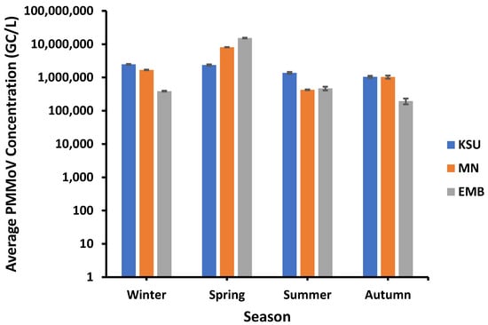 PMMoV showed higher concentrations in spring than the other seasons. For instance, the highest PMMoV average concentrations of approx. 8.09 × 106 GC/L and 1.53 × 107 GC/L were recorded in spring in both MN-WWTP and EMB-WWTP, respectively, whilst the highest average concentration of PMMoV at KSU-WWTP (ca. 2.47 × 106 GC/L) was found in winter (Figure 2).
