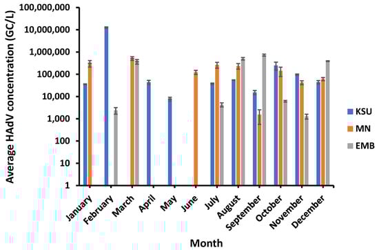 HAdVs were found positive in 75% of the samples, with the highest prevalence (83%) at KSU-WWTP and lowest prevalence (66.6%) at EMB-WWTP. Overall, HAdV ranged from 1.29 × 103 GC/L, which occurred in November, to 1.26 × 107 GC/L, recorded in February, in the raw water of EMB-WWTP and KSU-WWTP, respectively. However, the highest HAdV concentration detected in MN-WWTP was 5.15 × 105 GC/L (in March), and the lowest concentration of HAdV was 1.55 × 103 GC/L (in September). Compared to PMMoV concentration in MN-WWTP raw water, HAdV was found in a higher concentration in EMB-WWTP of 7.32 × 105 GC/L (in September) but still lower than that in KSU-WWTP raw water (Figure 6). On the other hand, HAdV was undetected in KSU-WWTP (in March and June), in MN-WWTP (in February, April, and May), and in EMB-WWTP (in January, April, May, and June).