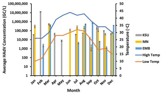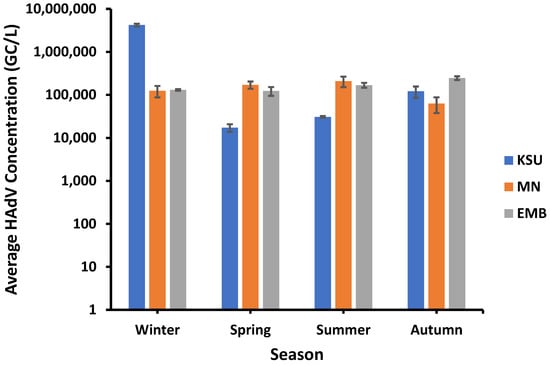 HAdV displayed the lowest concentrations in spring rather than the other seasons. For instance, the lowest HAdV average concentrations of approx. 1.73 × 104 GC/L and 1.24 × 105 GC/L were recorded in spring in both KSU-WWTP and EMB-WWTP, respectively, whilst the lowest average concentration of HAdV at MN-WWTP (ca. 6.27 × 104 GC/L) was detected in Autumn (Figure 7).