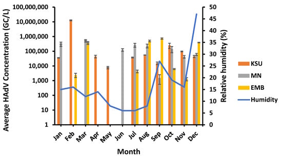 HAdV was observed in the highest concentrations at a moderate relative humidity of 12% and 16% at MN- and KSU-WWTPs (in March and February, respectively) and at a higher relative humidity of 27% in September at EMB-WWTP (Figure 9). The lowest HAdV concentrations were detected at various relative humidity levels ranging from low (8%) at KSU-WWTP to moderate (16%) at EMB-WWTP to high (27%) at MN-WWTP. Therefore, HAdV concentrations were not significantly influenced by the relative humidity (p > 0.05) at EMB-, MN-, and KSU-WWTPs (R2 = 0.19, 0.089, and 3.85 × 10−6, respectively; Table 3).