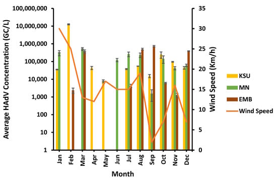 HAdV was found in the greatest concentrations at various wind speed levels. HAdV’s highest concentration was observed at low (2 Km/h), moderate (13 Km/h), and high (25 Km/h) wind speed levels at EMB-, MN-, and KSU-WWTP, respectively (Figure 10). The lowest HAdV concentrations were detected at a low wind speed of 2 Km/h in MN-WWTP and a moderate wind speed of 16–17 Km/h at EMB- and KSU-WWTP. Consequently, wind speed displayed no significant impact on HAdV concentrations (p > 0.05) at EMB-, MN-, and KSU-WWTPs (R2 = 0.25186, 0.056, and 0.25186, respectively; Table 3).