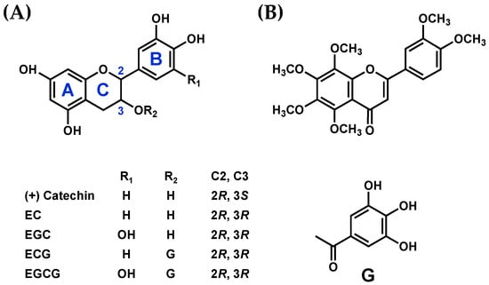 Polyphenols used in this study. (A) Structure of catechin. (B) Structure of nobiletin. G: galloyl group.