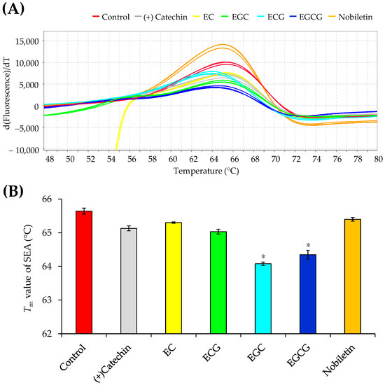 Catechins and nobiletin were selected as ligands and diluted in DMSO. SEA (final concentration, 5 μg/mL) and each ligand (final concentration, 0.25 mM) were mixed and incubated at 37 °C for 2 h. Then, 18 µL of the mixture were mixed with 2 µL of SYPRO orange (dye, 60×) from the Protein Thermal Shift Dye Kit (Thermo Fisher Scientific, Baltics UAB, Vilnius, Lithuania). Samples were denatured by increasing the temperature from 25 °C to 99 °C at a rate of 1.6 °C/min using the StepOnePlus Real-Time PCR System (Applied Biosystems, Foster City, CA, USA). To determine Tm values, data were analyzed using Protein Thermal Shift Software v1.0 (Applied Biosystems). The software calculates Tm value from each fluorescence profile using the Boltzmann method (fluorescence intensity vs. temperature plot) and the derivative curve method [d(fluorescence)/dT vs. temperature plot (Tm D)]. In the differential curve method, Tm is calculated from the peak apex of the differential plot, and in the Boltzmann method, each value is calculated from the inflection point of the fluorescence plot. In this study, we analyzed the thermal denaturation temperature of SEA using the change in Tm (Tm D) of the differential curve method as an indicator.