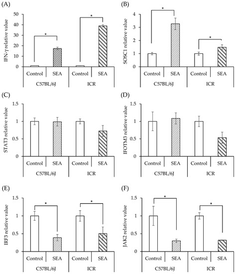 Comparison of SEA-induced JAK/STAT pathway-related gene expression in spleen cells from normal C57BL/6J and ICR mice. (A) IFN-γ, (B) SOCS1, (C) STAT3, (D) IFITM3, (E) IRF3, (F) JAK2. Spleen cells from normal mice (C57BL/6J and ICR mice) were exposed to SEA (50 ng/mL), and the expression of JAK/STAT pathway-related genes was examined by real-time RT-PCR. Gene expression was normalized to Hprt gene expression. The fold change was determined relative to the control without SEA. * p < 0.05 compared to the control. The values represent the mean ± standard deviation of three independent experiments.