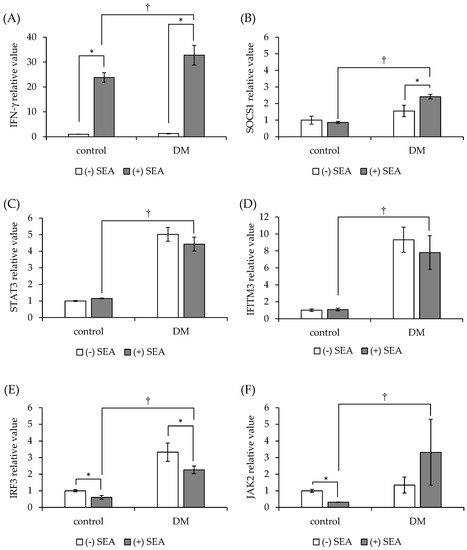 Comparison of SEA-induced JAK/STAT pathway-related gene expression in spleen cells from normal mice and diabetic mice (DM). (A) IFN-γ, (B) SOCS1, (C) STAT3, (D) IFITM3, (E) IRF3, (F) JAK2. Spleen cells from normal mice (control) and DM were exposed to SEA (50 ng/mL), and the expression of JAK/STAT pathway-related genes was examined by real-time RT-PCR. Gene expression was normalized to that of the Hprt gene. The fold change was determined relative to the control without SEA. * p < 0.05 compared to (−) SEA, † p < 0.05 compared to the control. The values represent the mean ± standard deviation of three independent experiments.