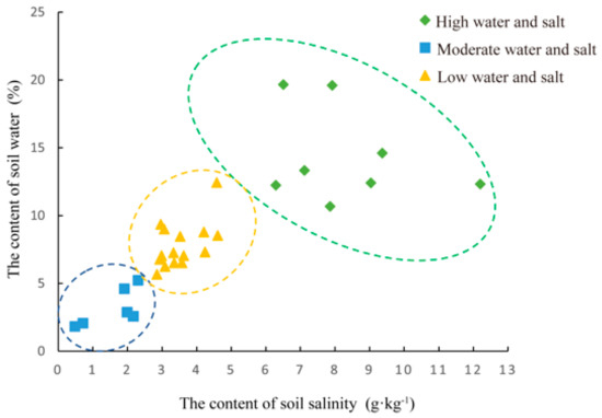 4.1. Variation of Soil Environmental Factors along the Water–Salt Gradients