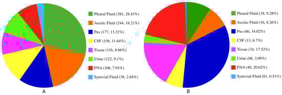 In this study, we enrolled a total of 1340 presumptive EPTB patients with diverse specimen types. All the enrolled specimens were categorized into several broad categories, as shown in Figure 1. Among them were pleural fluids (n = 318, 28.43%), ascitic fluids (n = 244, 18.21%), pus (n = 177, 13.21%), CSF (n = 156, 11.64%), tissues (n = 116, 8.66%), urine (n = 122, 9.1%), fine needle aspirates (FNAC) (n = 106, 7.91%), and synovial fluids (n = 38, 2.84%). A total of 194 (14.48%) cases were confirmed as bacteriologically TB-positive from all the testing methods mentioned above. Of the 194 positive cases, pleural fluids, ascitic fluids, pus, CSF, tissues, urine, FNAC, and synovial fluids were 18 (9.28%), 16 (8.26%), 66 (34.02%), 13 (6.7%), 34 (17.52%), 6 (3.09%), 40 (20.62%), and 1 (0.51%), respectively (Figure 1).