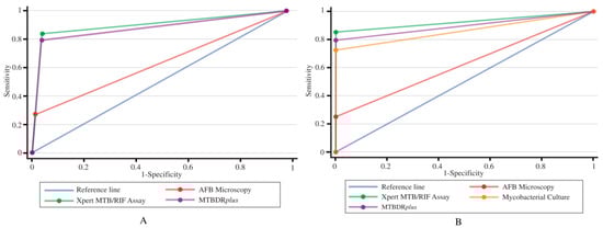 ROC curve analysis for the four TB diagnostic methods. (A) The AUC for AFB microscopy, Xpert MTB/RIF, and MTBDRplus when compared with the culture method. (B) The AUC for culture, AFB microscopy, Xpert MTB/RIF, and MTBDRplus when compared with CRS.