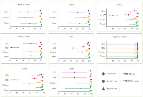 Diagnostic performance of four laboratory methods compared to CRS for EPTB detection in different specimen types. The bar represents a 95% confidence interval of three different diagnostic parameters: sensitivity, specificity, and accuracy.