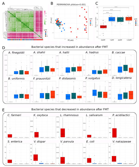 Fecal microbial transplantation (FMT) increases microbiome alpha diversity, increases the abundance of homeostatic bacteria, and decreases the abundance of opportunistic potentially pathogenic bacteria. (A) Hierarchical clustering on Bray–Curtis distances between all pairs of samples included in this study. (B) Principal coordinate analysis on Bray–Curtis distances between all pairs of samples included in this study. (C) Shannon diversity indices for each sample. In (A–C), 0 WPF, 1 WPF, 4 WPF, and 12 WPF refers to weeks post-FML. Hollow circles represent the Shannon index of individuals, while solid dots represent additional marks for observations considered outliers. *** refers to corrected p values < 0.001. (D) Ten representative species that were found increased after FMT (A. finegoldii: Alistipes finegoldii; A. shahii: Alistipes shahii; A. hallii: Anaerobutyricum hallii; A. hadrus: Anaerostipes hadrus; B. caccae: Bacteroides caccae; B. uniformis: Bacteroides uniformis; F. prausnitzii: Faecalibacterium prausnitzii; P. distasonis: Parabacteroides distasonis; P. vulgatus: Phocaeicola vulgatus; D. longicatena: Dorea longicatena). (E) Ten representative species that were found decreased after FMT (C. farmeri: Citrobacter farmeri; K. oxytoca: Klebsiella oxytoca; L. rhamnosus: Lacticaseibacillus rhamnosus; L. salivarius: Ligilactobacillus salivarius; P. acidilactici: Pediococcus acidilactici; S. enterica: Salmonella enterica; V. dispar: Vaillonella dispar; V. parvula: Veillonella parvula; E. coli: Escherichia coli; V. nakazawae: Veillonella nakazawae).