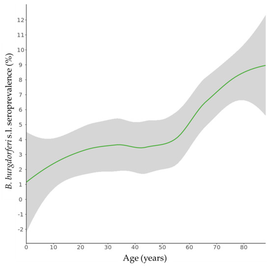 Smooth age-specific seroprevalence of B. burgdorferi sensu lato (s.l.) antibodies in the general population of The Netherlands. Grey areas indicate 95% confidence intervals.
