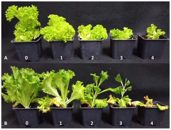 Disease index scale (0–4) used for evaluation of Fusarium wilt severity on (A) “Lugano” and (B) “Sandalina” lettuce cultivars artificially inoculated with Greek F. oxysporum f. sp. lactucae isolates, where 0 = healthy plant; 1 = initial symptoms of leaf chlorosis, slight reduction in development, slight vascular browning; 2 = severe leaf chlorosis, evident reduction in development, sometimes asymmetric development of the head, evident vascular browning; 3 = leaf chlorosis and inhibition of growth, evident deformation and initial vascular browning symptoms of wilting during the hottest hours of the day; and 4 = plant strongly deformed with leaf chlorosis or completely necrotic leaves, totally wilted. Disease index scale symptoms depicted in the figure correspond to characteristic symptoms recorded throughout the pathogenicity testing with the different isolates for the same cultivar.