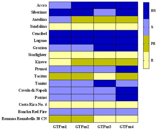 Reaction of commercial and differential lettuce cultivars to the artificial inoculation with the four Greek F. oxysporum f. sp. lactucae isolates (GTFus1-4) used in this study. The heatmap was constructed based on the pathogenicity test results expressed as a disease index of 0 to 100 and depicted in terms of resistance–susceptibility. Resistant cultivars (R) are indicated by a pale yellow color, partially resistant (PR) by olive green, susceptible (S) by light blue, and the highly susceptible ones (HS) are indicated by a dark blue color, as explained by the color scale at the right side of the figure.