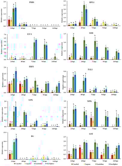 To determine whether the observed differences in cultivar susceptibility were related to biochemical resistance mechanisms, the expression of 10 defense-related genes (HPL1, LTC1, SOD, PRB1, PAL1, LOX, ERF1, MPK, BG, GST) was measured in artificially inoculated lettuce plants of the two most susceptible (cvs. “Cencibel” and “Lugano”) and the two most resistant (cvs. “Sandalina” and “Starfighter”) cultivars. Data on gene expression measurements are shown in Figure 4.