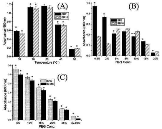 Abiotic stress tolerance activities of potential Bacillus strains SR2 (Bacillus licheniformis) and SR18 (Bacillus velezensis) (A) Temperature (10 to 50 °C) (B) Salinity Nacl (0.5 to 20%) (C) Drought PEG (5 to 32.6%). Experimental data are averages of three replicates. Bars display mean ± SE and statistical analysis was performed using a one-way ANOVA with a Tukey post hoc test. Differences between means were considered to be significant if the calculated p-values were p < 0.05 ** and p < 0.01 *.