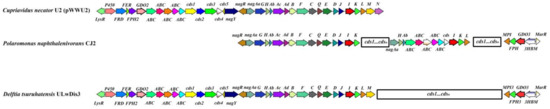 The chromosome of the D. tsuruhatensis strain ULwDis3 contains all the genes required for the oxidation of naphthalene via salicylate and gentisate to the Krebs cycle intermediates. These genes are organized into a single operon and are located in a region of about 15 kb. In the course of the work, for each gene, its position, G + C content, product size, and proposed function were determined (Table S1, Figure S2). The genetic control of naphthalene degradation via salicylate and gentisate was first described in detail for two members of β-Proteobacteria: Cupriavidus necator U2 (formerly Ralstonia sp.) (ASM966368v2) and Polaromonas naphthalenivorans CJ2 (CP000529.1) [34,35]. The structure, DNA sequence, and deduced amino acid sequence of naphthalene catabolic genes on chromosome ULwDis3 were compared with other complete nag operons involved in naphthalene degradation (Table S1, Figure S2). The organization and arrangement of the nag genes in the ULwDis3 strain are identical to those in the C. necator strain U2 [34,36]; however, the naphthalene degradation genes in the latter have plasmid localization (Figure 2). In addition, the nag operon of D. tsuruhatensis strain ULwDis3 lacks the nagN gene encoding a protein with an unknown function. Thus, in the D. tsuruhatensis strain ULwDis3, the nag operon contains 17 genes, nagAaGHAbAcAdBFCQEDJIKLM. The identity of the deduced amino acid sequences of most nag genes of the strain ULwDis3 with the corresponding sequences of the plasmid pWWU2 from C. necator strain U2 was 100 % (Table S1). The exceptions were the nagAd, nagB, nagF, and nagJ genes, for which the level of amino acid identity was about 99.5–99.8%. The open reading frame (ORF) located upstream of the nagAa gene and oriented in the opposite direction from this gene had a high degree of homology (100%) with the corresponding sequence of the naphthalene catabolic strains C. necator U2 and Burkholderia sp. BC1 (KX155564.1). This sequence encodes the LysR-family transcriptional regulator (NagR) for the expression of the nag operon; NagR has a conserved DNA-binding (helix–turn–helix) domain in the N-terminal region. Upstream of the nagR gene is the ORF that putatively encodes the chemotaxis protein, NagY. This ORF is transcribed in the opposite direction from the nahR gene. The deduced amino acid sequence of the nahY gene also showed a high degree of identity with the corresponding sequences of the strains C. necator U2 and Burkholderia sp. BC1. The genes of naphthalene degradation via gentisate of P. naphthalenivorans strain CJ2 show a significant degree of homology with the nag genes of C. necator U2 [35]. However, as in the case of the D. tsuruhatensis strain ULwDis3, the catabolic genes of P. naphthalenivorans CJ2 have a chromosomal localization. The identities of the deduced amino acid sequences of the nag genes of D. tsuruhatensis strain ULwDis3 with the corresponding sequences of strain P. naphthalenivorans CJ2 were 31.1–95.9% (Table S1). The lowest similarity in amino acid sequences was observed for fumarylpyruvate hydrolase.
