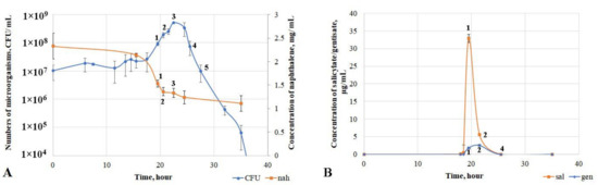 A high-performance liquid chromatograph (Agilent 1260, Agilent Technologies, USA) with a UV detector was used to estimate the concentration of salicylate and gentisate. To determine the metabolites, 1 mL of culture medium was first acidified to pH 2; then, the resulting suspension was passed through a filter with a 0.22 µm pore size. The wavelengths were as follows: gentisate, 280 nm; salicylate, 300 nm. A Synergi Hydro-RP chromatographic column (150 × 4.6 mm id, 4 μm) was used. The column thermostat temperature was 25 °C; the injected sample volume was 10 μL. Eluents: A, 5% acetonitrile: 5% 0.1% trifluoroacetic acid: 90% water; B, 5% 0.1% trifluoroacetic acid: 95% acetonitrile. Flow rate, 0.75 mL/min. Gradient elution: 0 min, 5%; 15 min, 15%; 22.5 min, 40%; 25 min, 40%; 25.5 min, 95%; 30 min, 95%.