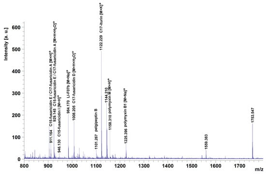 - Vater, J.; Niu, B.; Dietel, K.; Borriss, R. Characterization of novel fusaricidins produced by Paenibacillus polymyxa M1 using MALDI-TOF mass spectrometry. J. Am. Soc. Mass Spectrom. 2015, 26, 1548–1558. [Google Scholar] [CrossRef]
