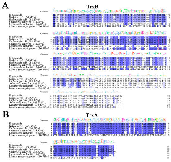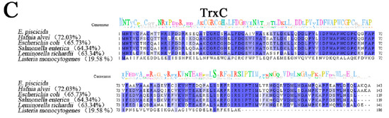 E. piscicida TrxB, TrxBEp (ETAE_2202), is a 323-amino-acid protein encoded by a 972 bp open reading frame (ORF). Bioinformatics analysis reveals that the predicted molecular weight of TrxBEp is 34.59 kDa, and the isoelectric point of TrxBEp is 5.47. E. piscicida TrxA, TrxAEp (ETAE_0099) contains a 327 bp ORF, which codes 108 amino acid residues with a calculated molecular mass of 11.59 kDa and a theoretical pI of 5.04. E. piscicida TrxC, TrxCEp (ETAE_0559) has a 143 bp ORF, which codes 143 amino acid residues with a calculated molecular mass of 15.80 kDa and a theoretical pI of 5.31. As shown in Figure 1, TrxAEp, TrxBEp, and TrxCEp share high amino acid sequence identities with homologues of many Gram-negative bacteria, including H. alvei, E. coli, S. enterica, and L. richardisequence; however, they share low sequence identities (36.59%, 40.74%, and 19.58%, respectively) with the Gram-positive stain L. monocytogenes.