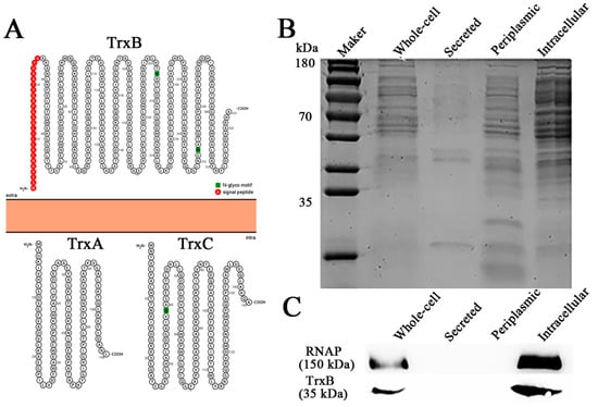 Cellular localization of TrxBEp. (A) Protter illustration of TrxBEp, TrxAEp and TrxCEp. (B) protein components of Edwardsiella piscicida cells. (C) The distribution of TrxBEp tested by Western blot.