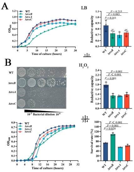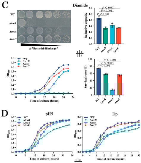 In order to further study the function of the thioredoxin system, we constructed three mutants—ΔtrxA, ΔtrxB, and ΔtrxC—by deleting the gene segment from 64 to 234 of trxAEp, 115 to 858 of trxBEp, and 103 to 319 bp of trxCEp (Figure S4).