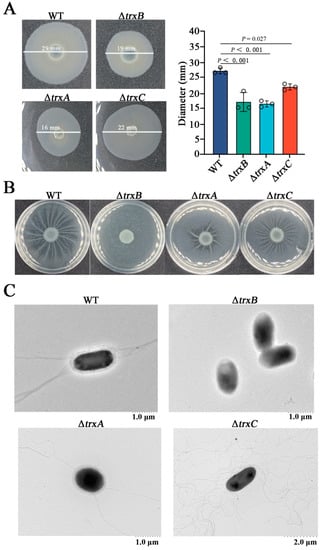 3.5. The Trx System Is Essential for Bacterial Motility and Flagellum Formation