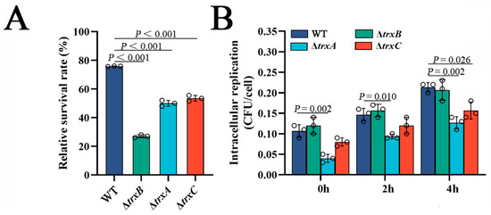 Resistance against host serum killing is an important virulence characteristic of E. piscicida [40], thus we examined the effect of the thioredoxin system. The results show that three Trx mutants exhibited remarkably lower survival rates than the WT, with the lowest-ranking strain being ΔtrxB (27%), which was much lower than ΔtrxA and ΔtrxC (about 50%) (Figure 5A). This result suggests that the thioredoxin system is involved in bacterial resistance against serum killing.