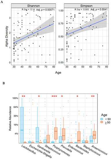 Correlation between alpha diversity (A) or relative abundance (B) and age in our study population. * indicates statistically significant difference between age groups (* <0.05, ** <0.005, *** <0.0005).