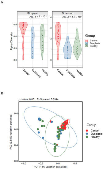 Alpha (A) and beta (B) diversity indices among women with cervical cancer, women with dysplasia, and healthy women. Beta diversity comparisons were calculated using the principal coordinate analysis discriminate. Abundance profiles in women with cervical cancer (n = 60) were different from those of women with dysplasia (n = 25) and healthy women (n = 35).