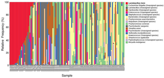 Next, we characterized the microbiota taxa abundances in our cohort. A stacked bar plot (Figure 3) showed distinct patterns of taxa in our cohort. Lactobacillus was the dominant genus.