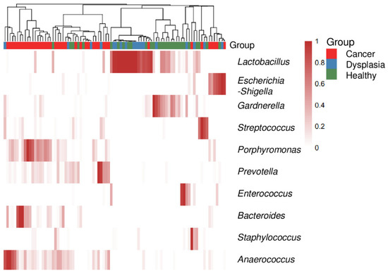 The relative abundance of cervicovaginal microbiota at the genus and species level was also characterized. The top 10 most abundant genera in the samples varied by group. A heat map (Figure 4) reflected the relative abundance of the most prevalent bacterial genera, showing that cervicovaginal microbiota composition changed from less diverse and more Lactobacillus-dominant in dysplasia to more diverse and less Lactobacillus-dominant in cervical cancer. Compared with healthy women and women with dysplasia, many of the women with cervical cancer had more Porphyromonas species (Figure 4 and Figure S4).