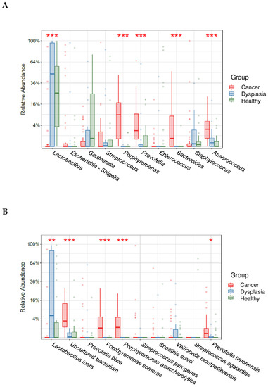 Relative abundance of the top 10 most abundant genera (A) and species (B) in women with cervical cancer, women with dysplasia, and healthy women. * indicates statistically significant difference between age groups (* <0.05, ** <0.005, *** <0.0005).
