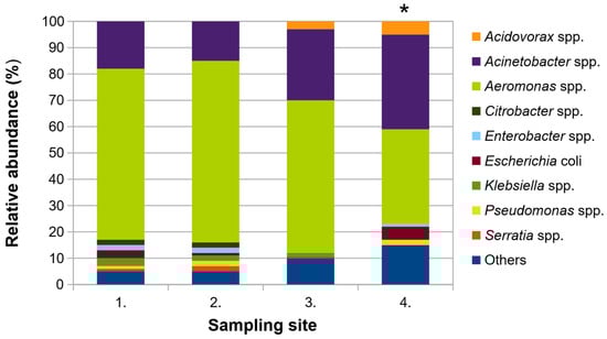 The composition of cultivable bacterial communities in different stages of the wastewater treatment process in Kokšov-Bakša, (Košice, Slovakia). The category “Others” groups bacteria whose relative abundance was within the community below 2%, such as Achromobacter spp., Kluyvera spp., Lactobacillus spp., Lactococcus spp., Leuconostoc spp., Providencia spp., Raoultella spp. and unreliable identified isolates by MALDI-TOF MS. 1.—inflow, 2.—mechanical wastewater treatment, 3.—biological wastewater treatment, 4.—outflow. * Significant reduction in the number of Aeromonas spp. and significant increase in the number of Acinetobacter spp. during the wastewater treatment process (Chi-square test, p < 0.05).