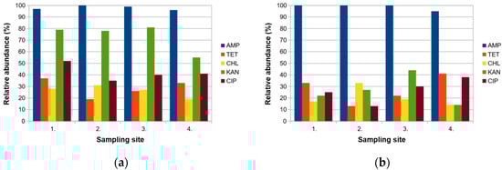 Almost all bacterial isolates showed resistance to ampicillin (the occurrence ranged from 96% to 100%, depending on the sampling site). Moreover, kanamycin-resistant isolates achieved a very high prevalence (ranging from 55% to 81%). Resistance to other antibiotics occurred with significantly lower frequency (Figure 2a). No significant changes were observed in the prevalence of antibiotic-resistant isolates during the wastewater treatment process (Chi-square test, p < 0.05).