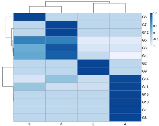 Genotype distribution of Acinetobacter spp. during the wastewater treatment. The darkest color shows the unique genotypes (G1–G14) of Acinetobacter spp. for sampling site. 1.—inflow, 2.—mechanical wastewater treatment, 3.—biological wastewater treatment, 4.—outflow.