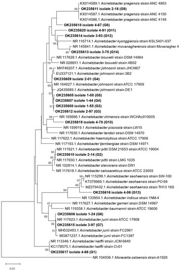 Phylogenetic placement of representative Acinetobacter strains (OK235605-OK235620) from the wastewater treatment plant within the genus Acinetobacter. G1–G14—genotypes obtained based on digestion of 16S rRNA gene using three different restriction enzymes AluI, MspI and RsaI. Phylogenetic tree was constructed using neighbor-joining method with 1000 bootstrap replications. The evolutionary distances were computed using Kimura 2-parameter model.